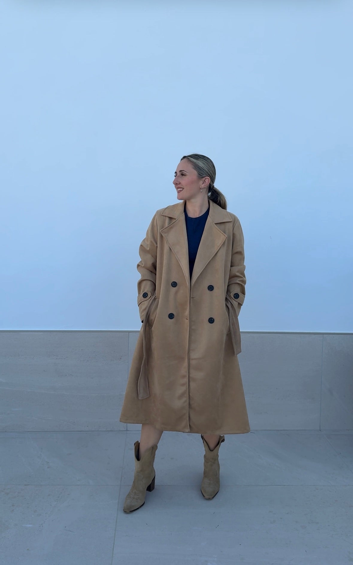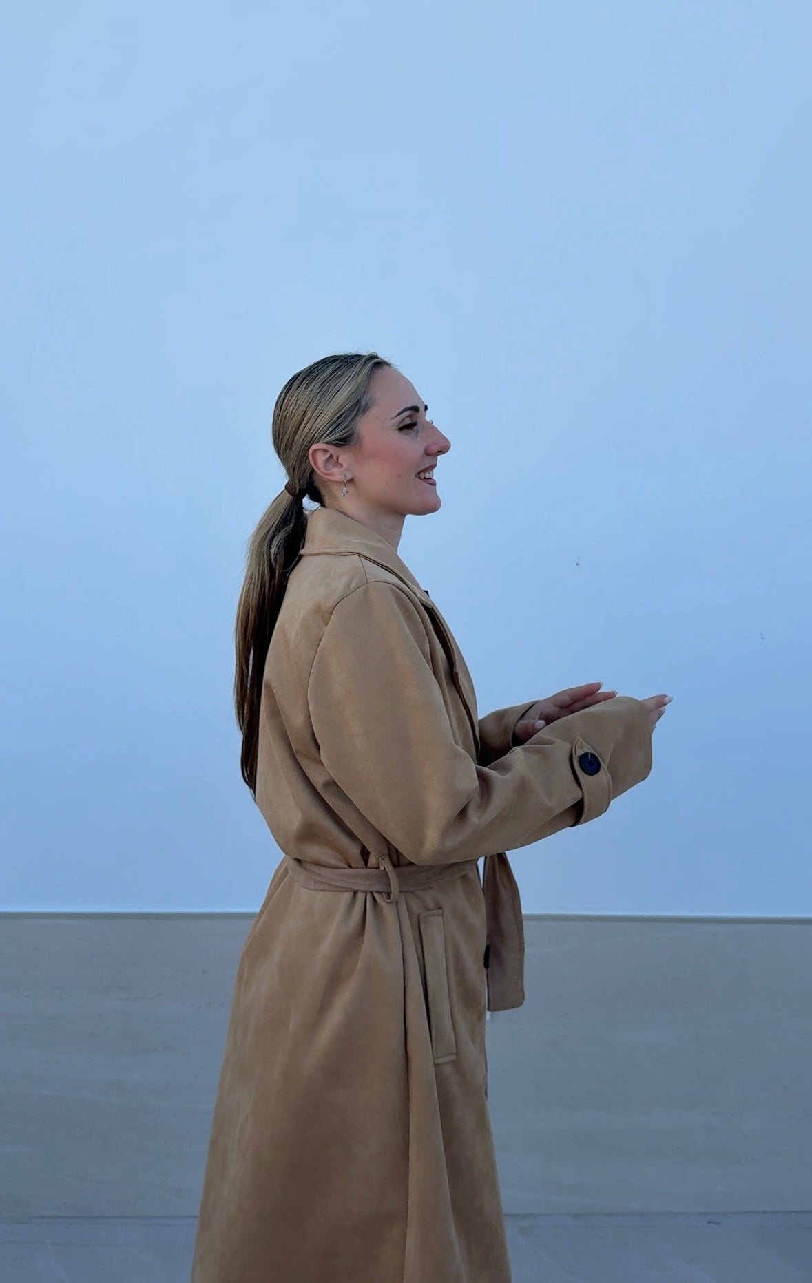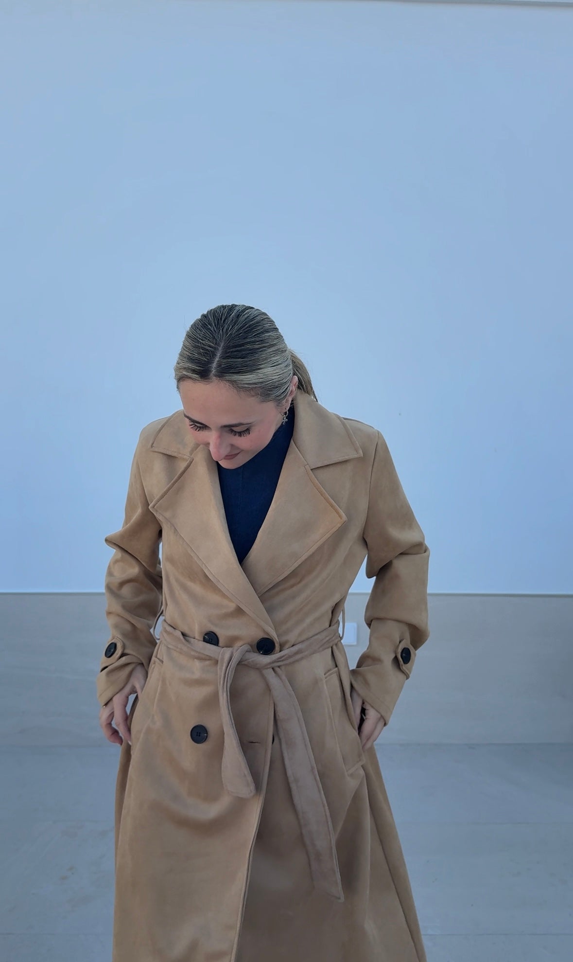 Abrigo largo de ante con botones y bolsillos, con cinturón incorporado.