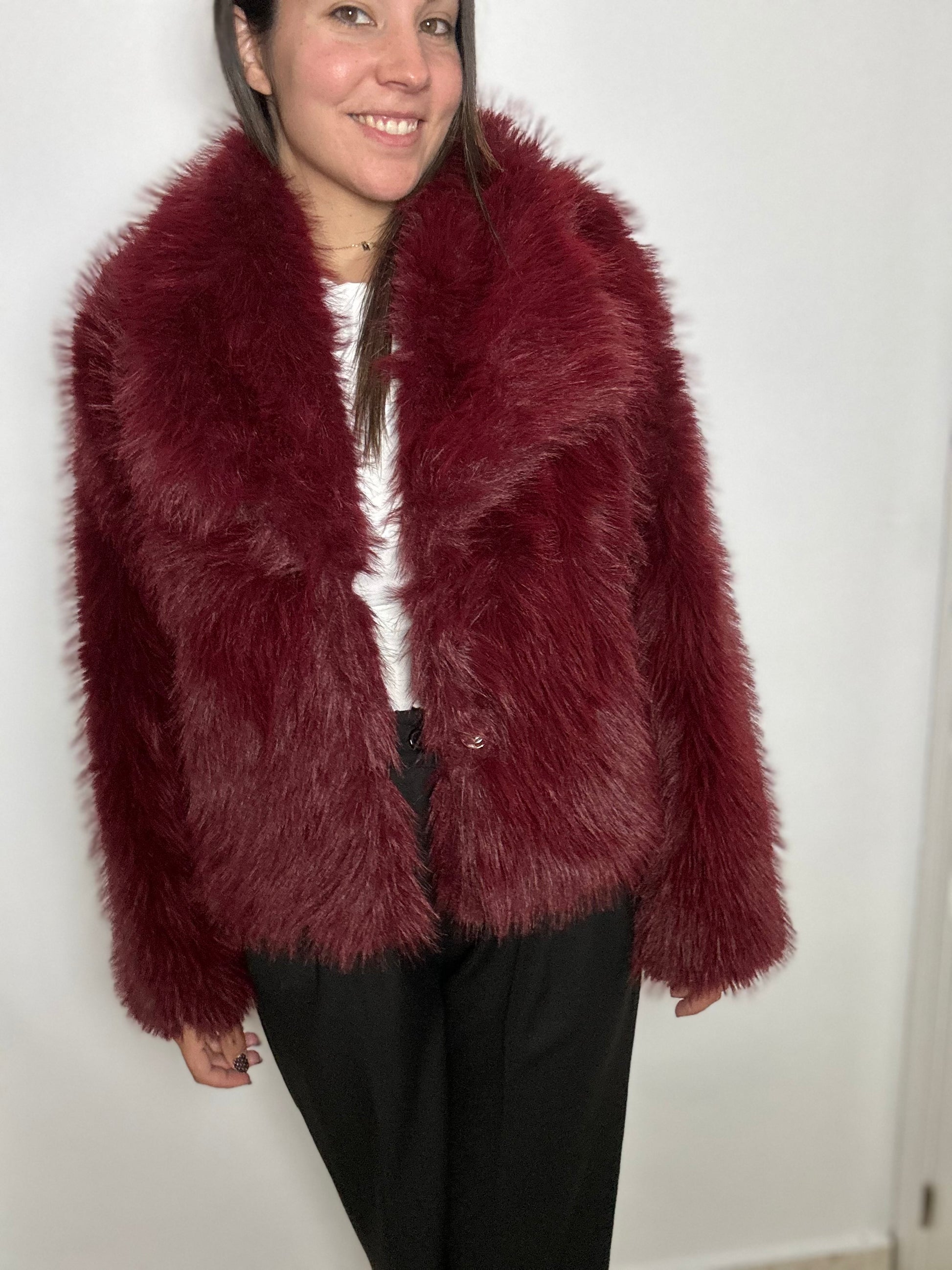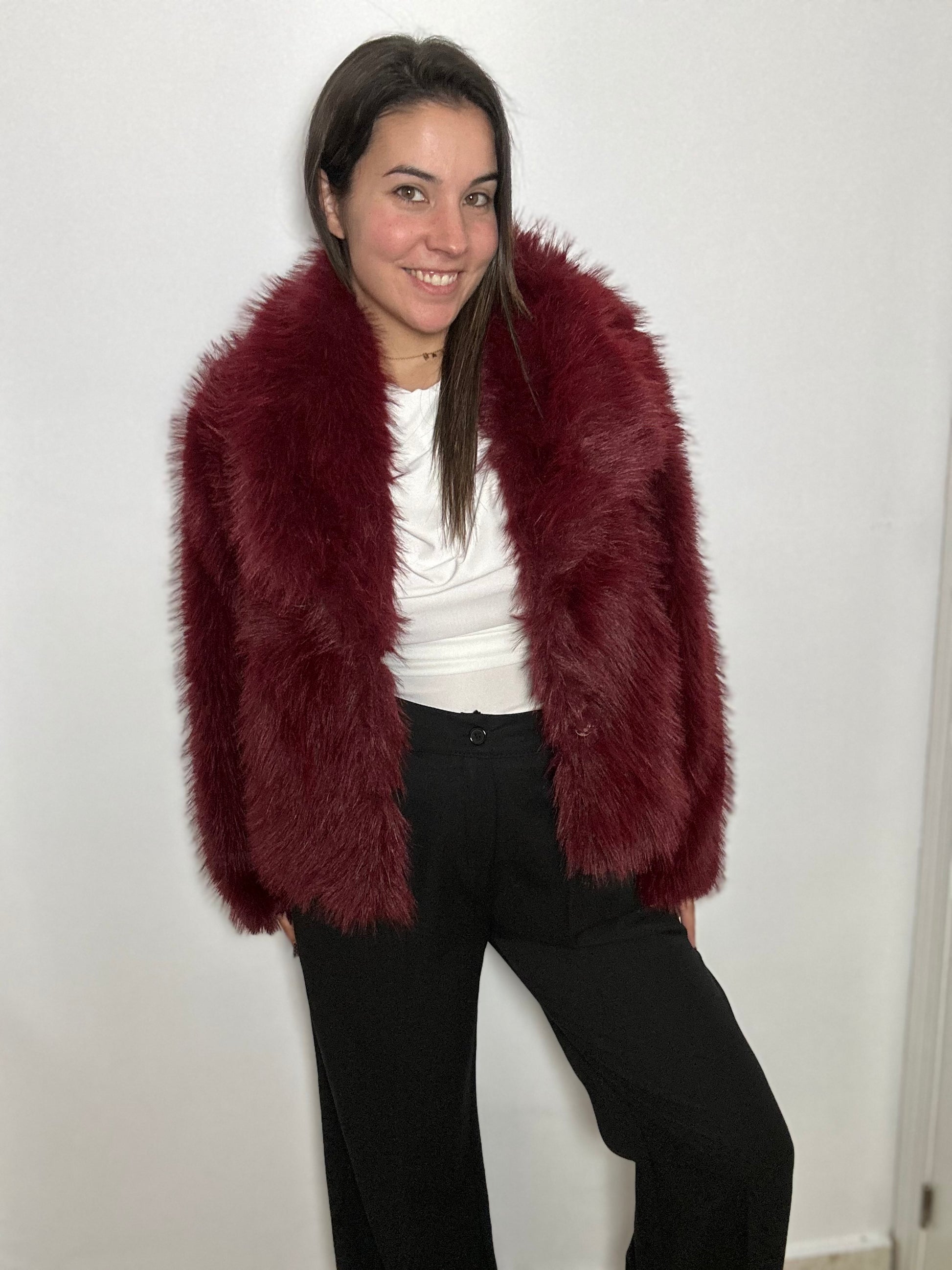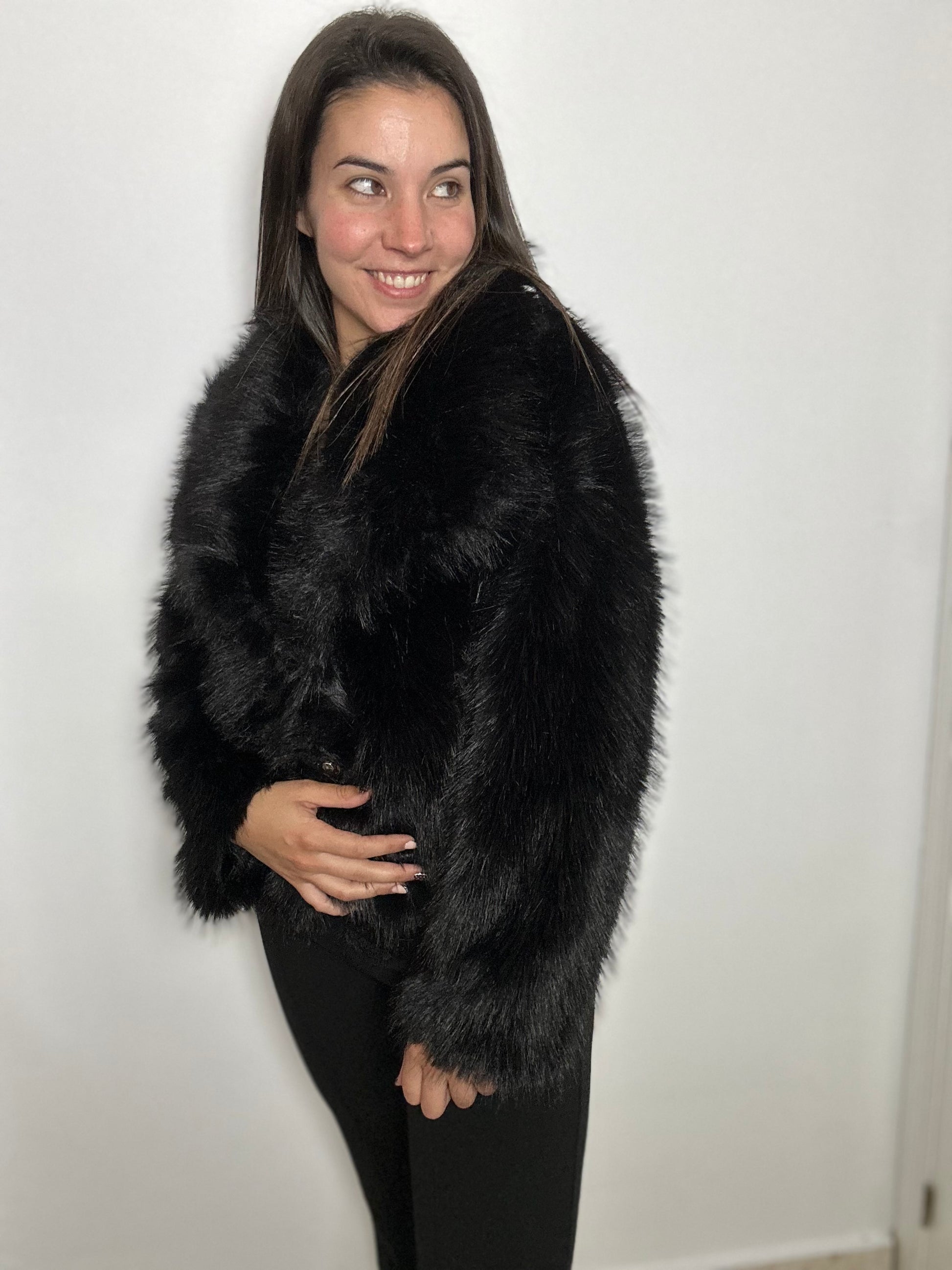 Abrigo de pelito forrado por dentro. Con bolsillos y broche.