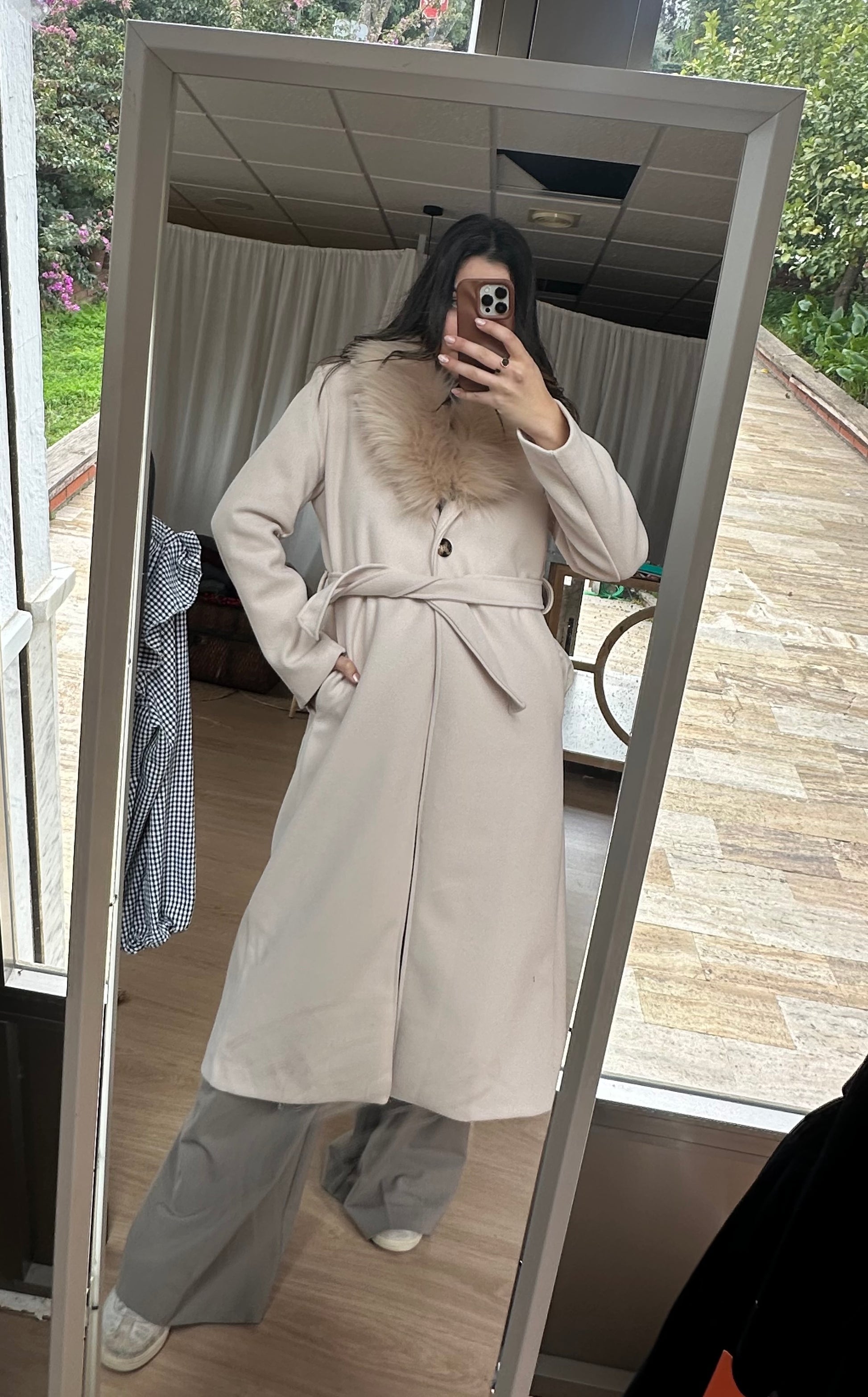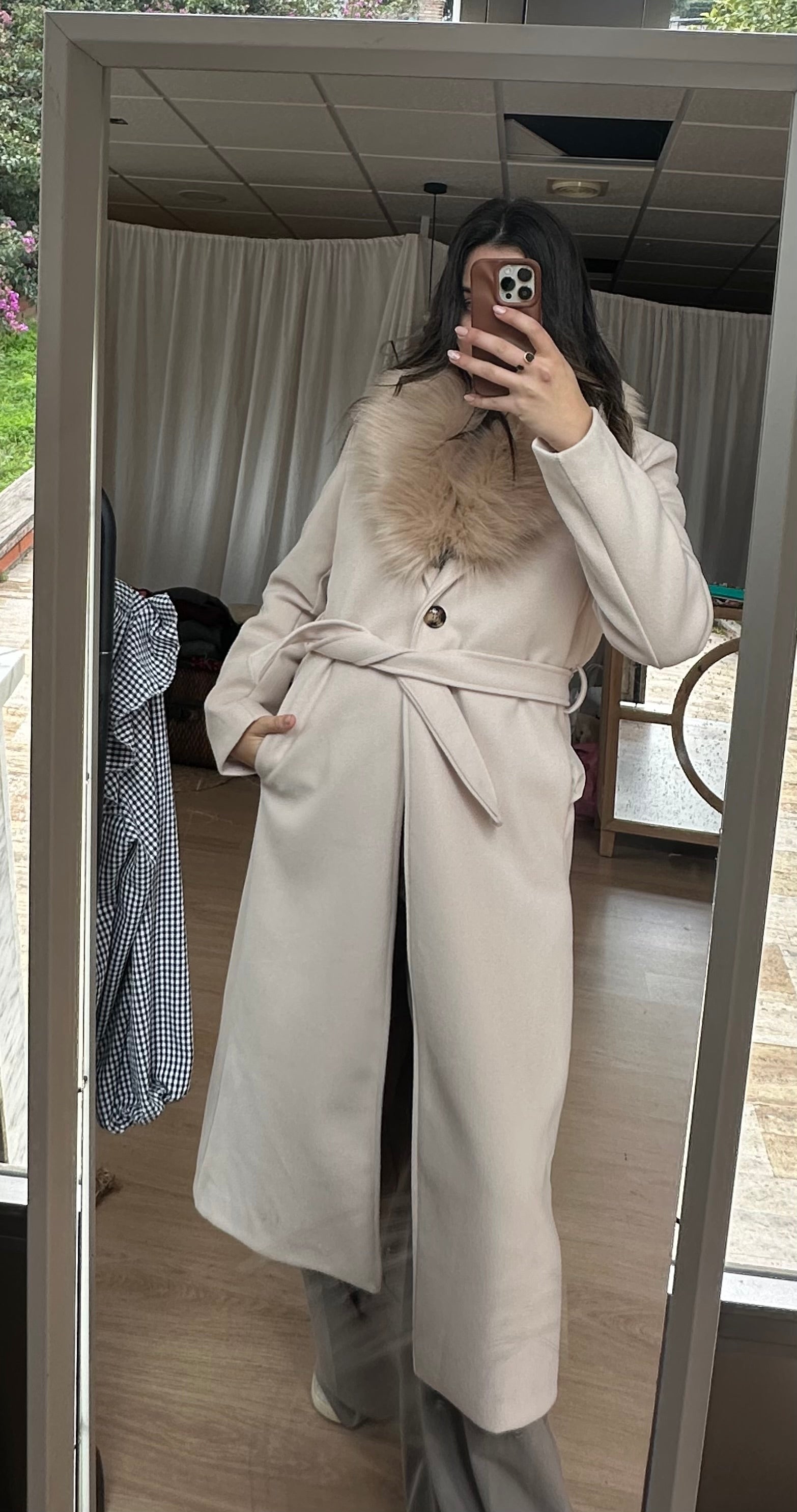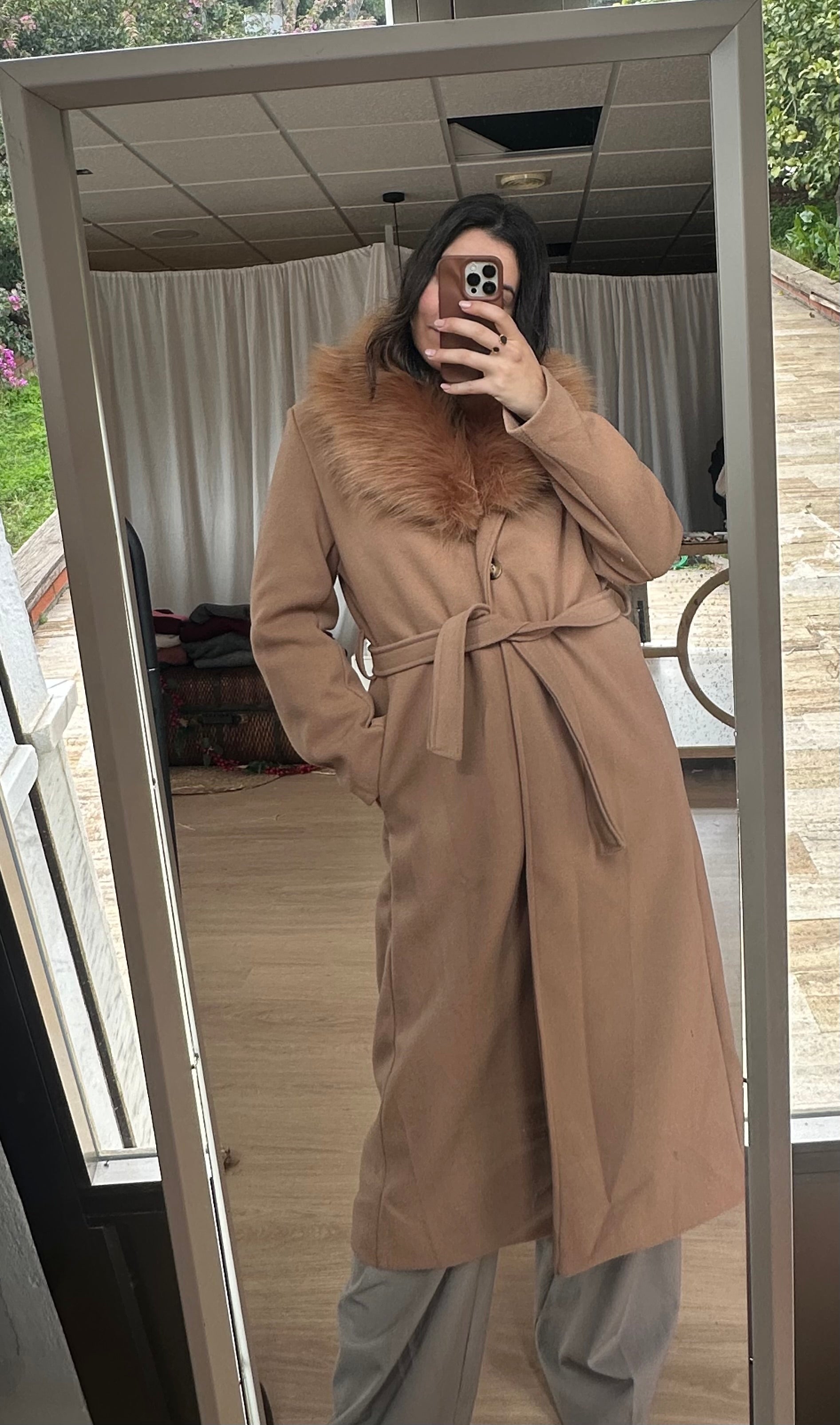 Abrigo de paño largo con detalle de cuello de pelos que se puede quitar y poner. Con cinturón y bolsillos, completamente forrado por dentro. Talla única hasta 44.