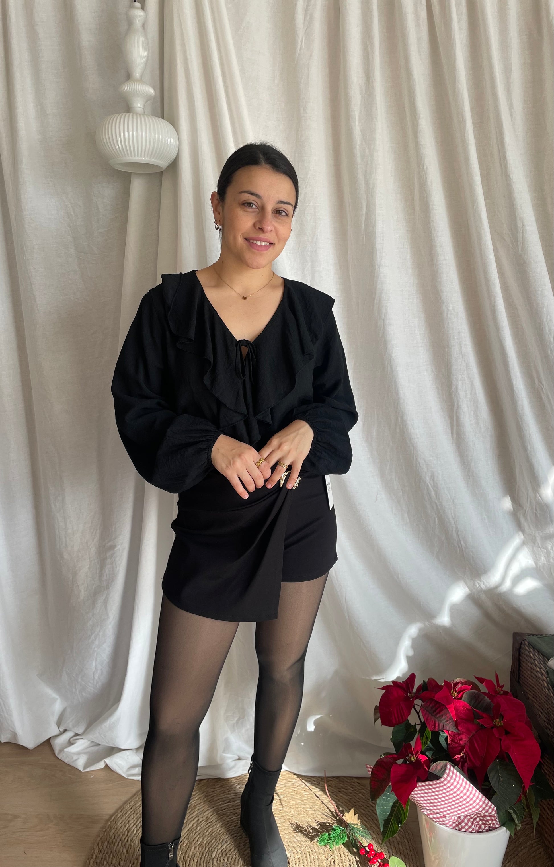 Blusa de algodón con detalle de lazo y volante. Talla única hasta 42.