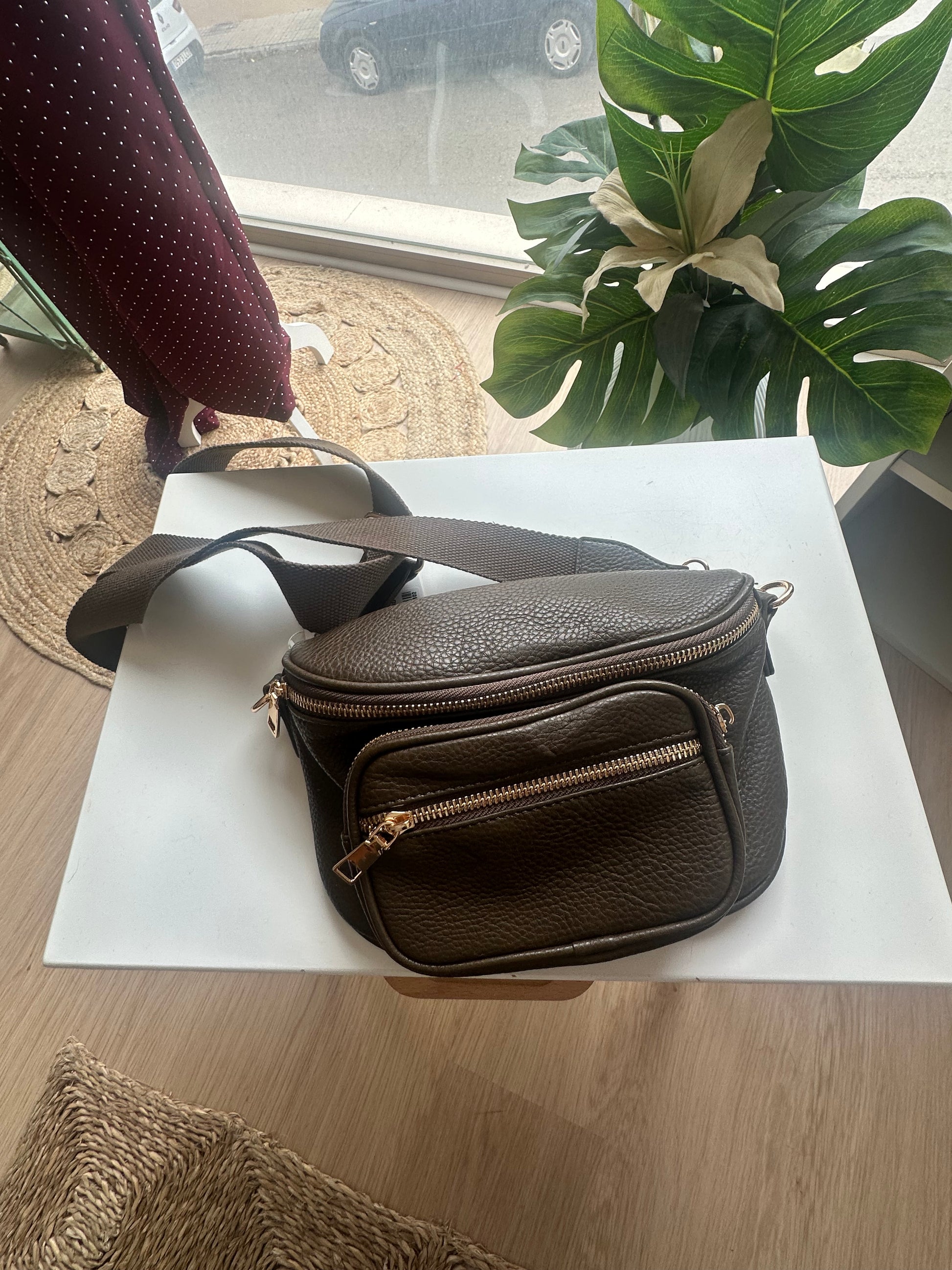 Bolsito estilo riñonera con doble cremallera y cuerda para bandolera.