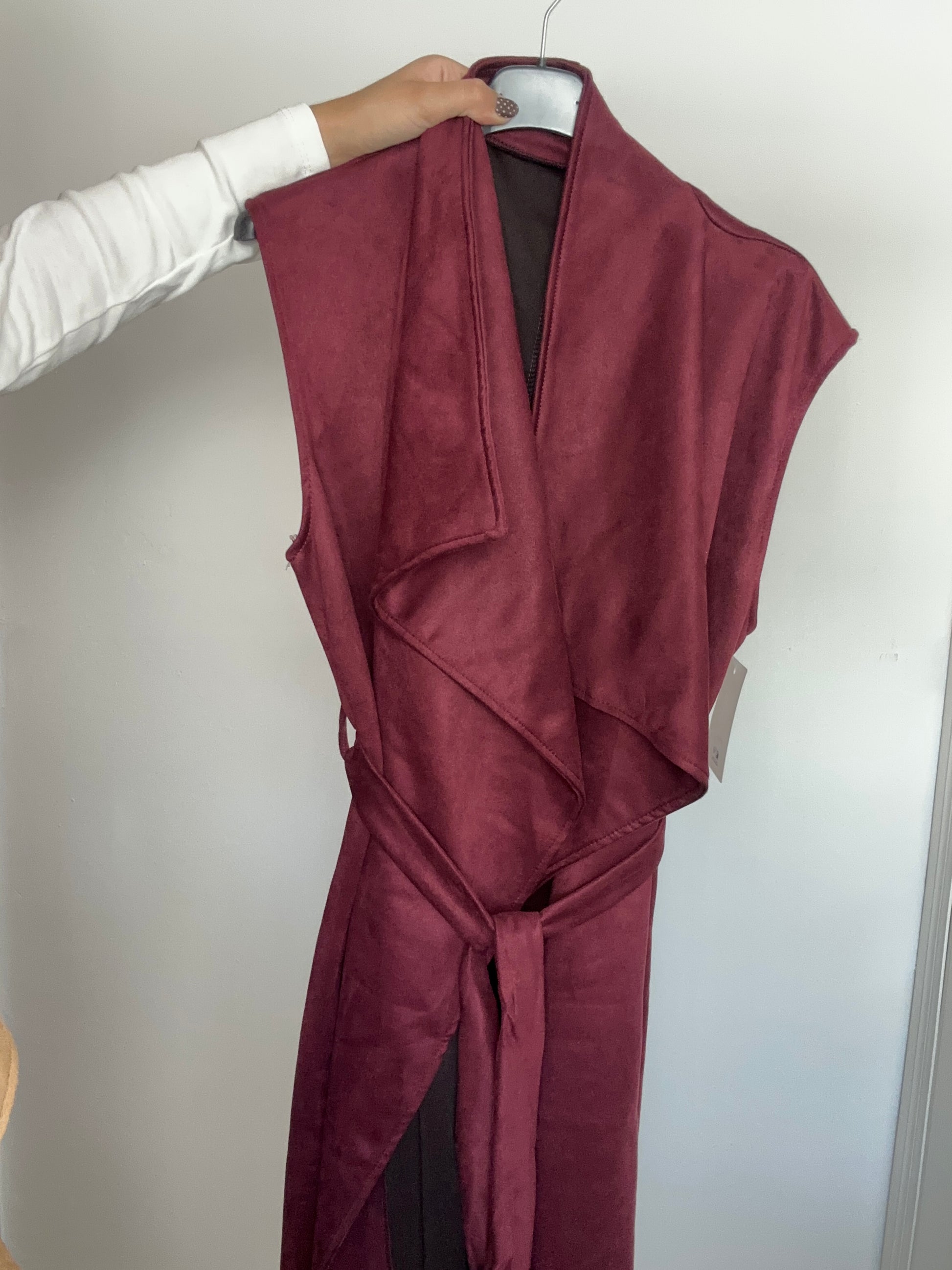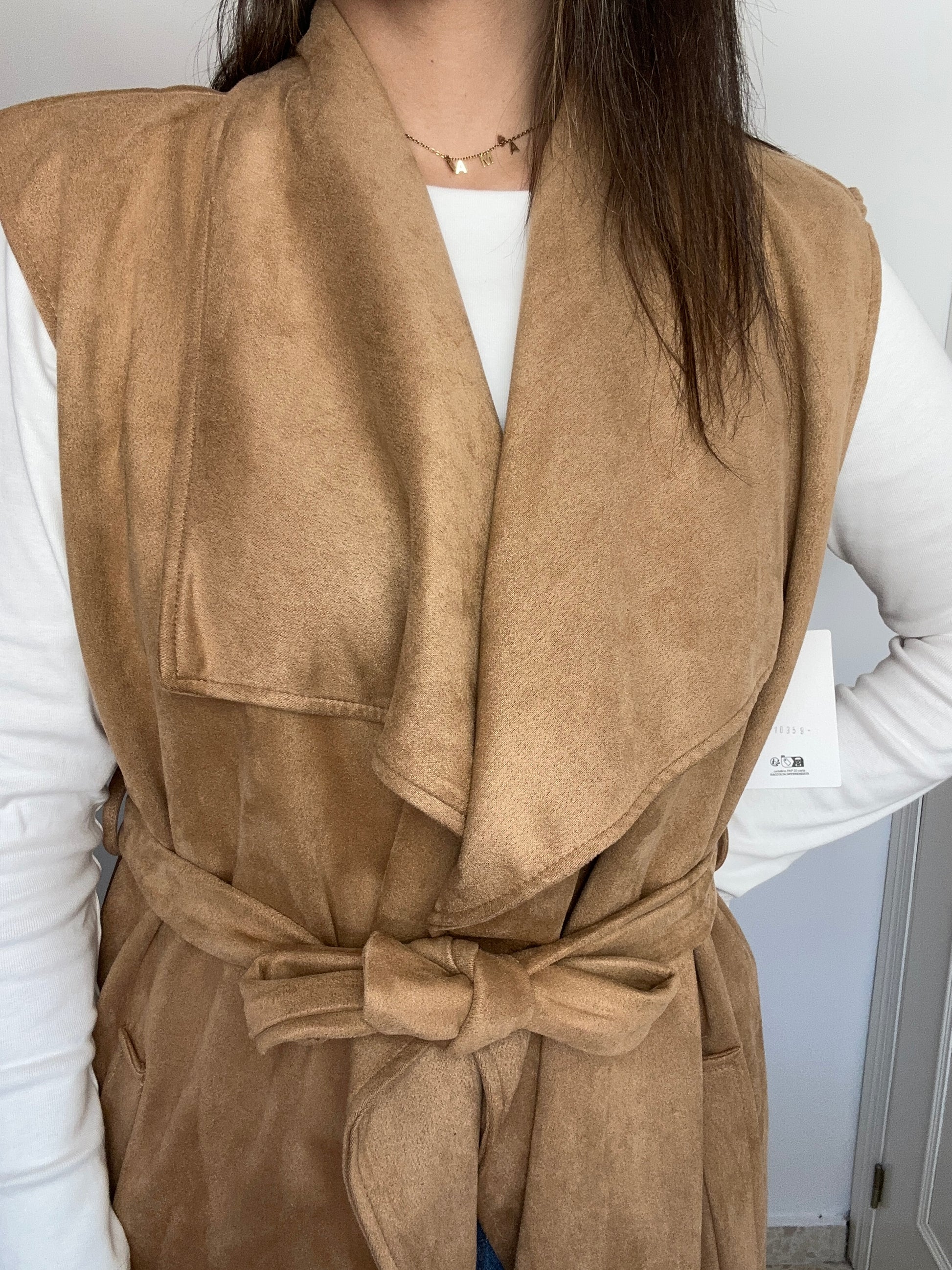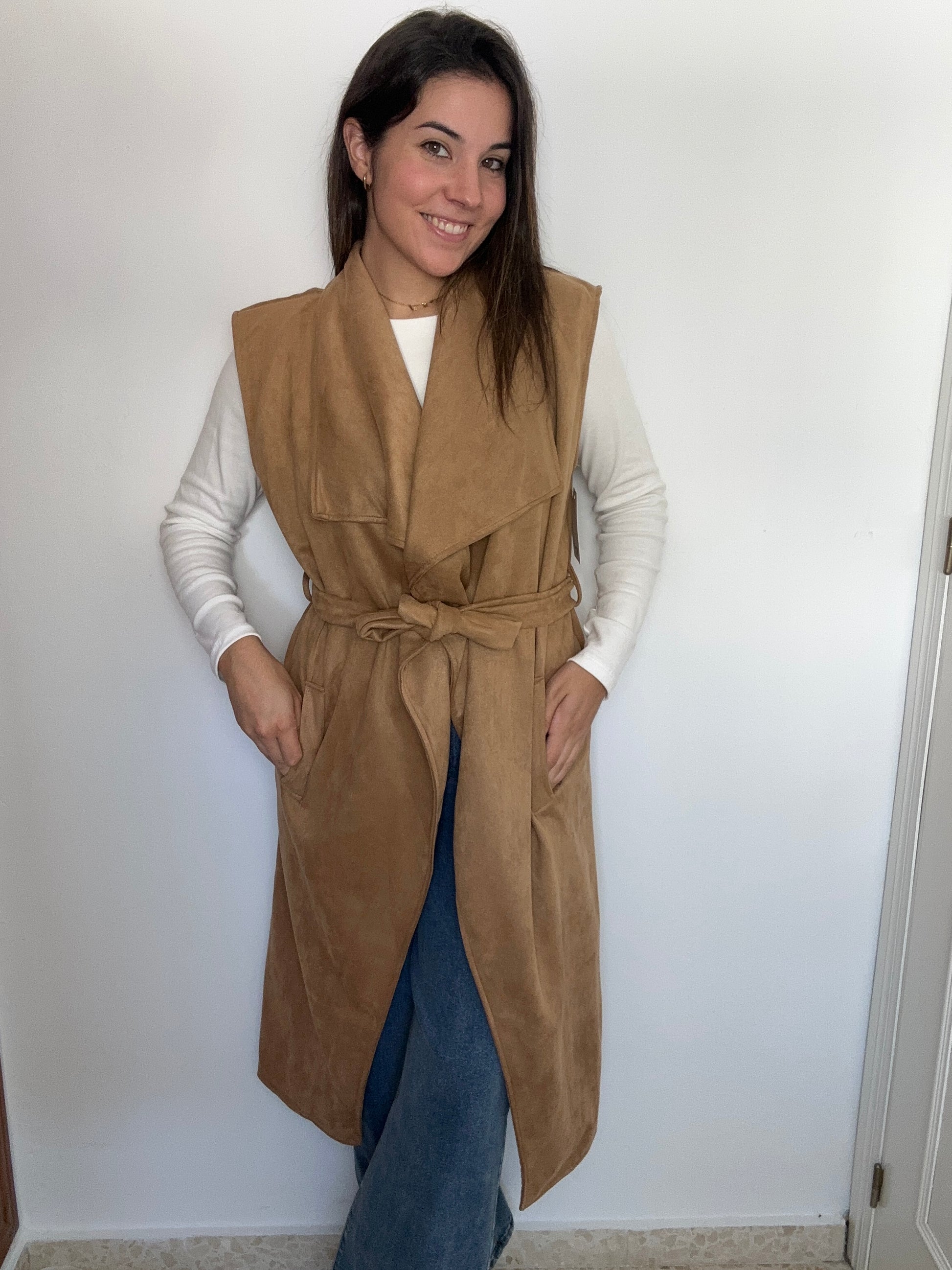 Chaleco largo sin mangas con cuello grande y cinturón de ante. Talla única hasta 48.