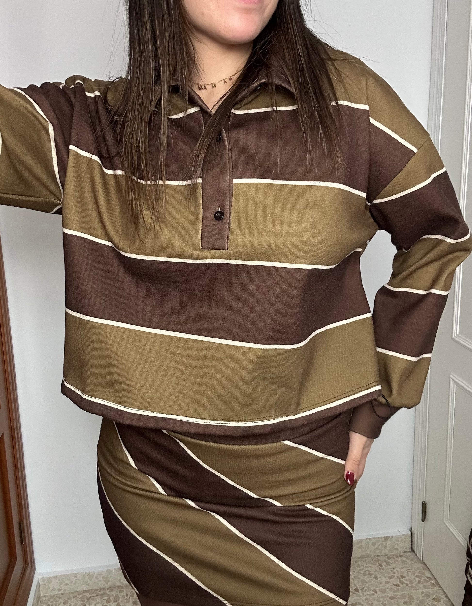 Conjunto de falda corta a rayas verde/marron con polito a juego. Talla única 36/38.