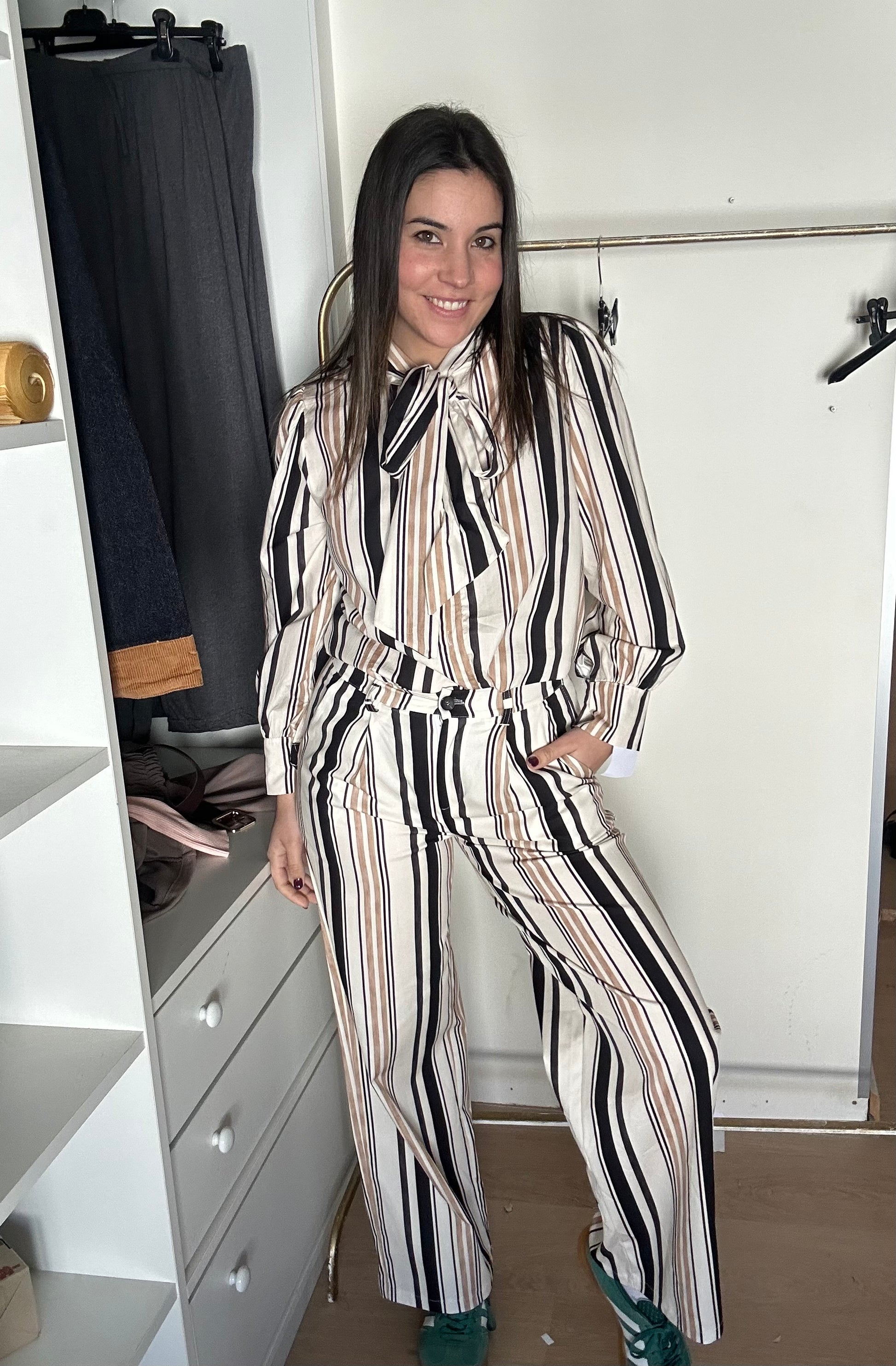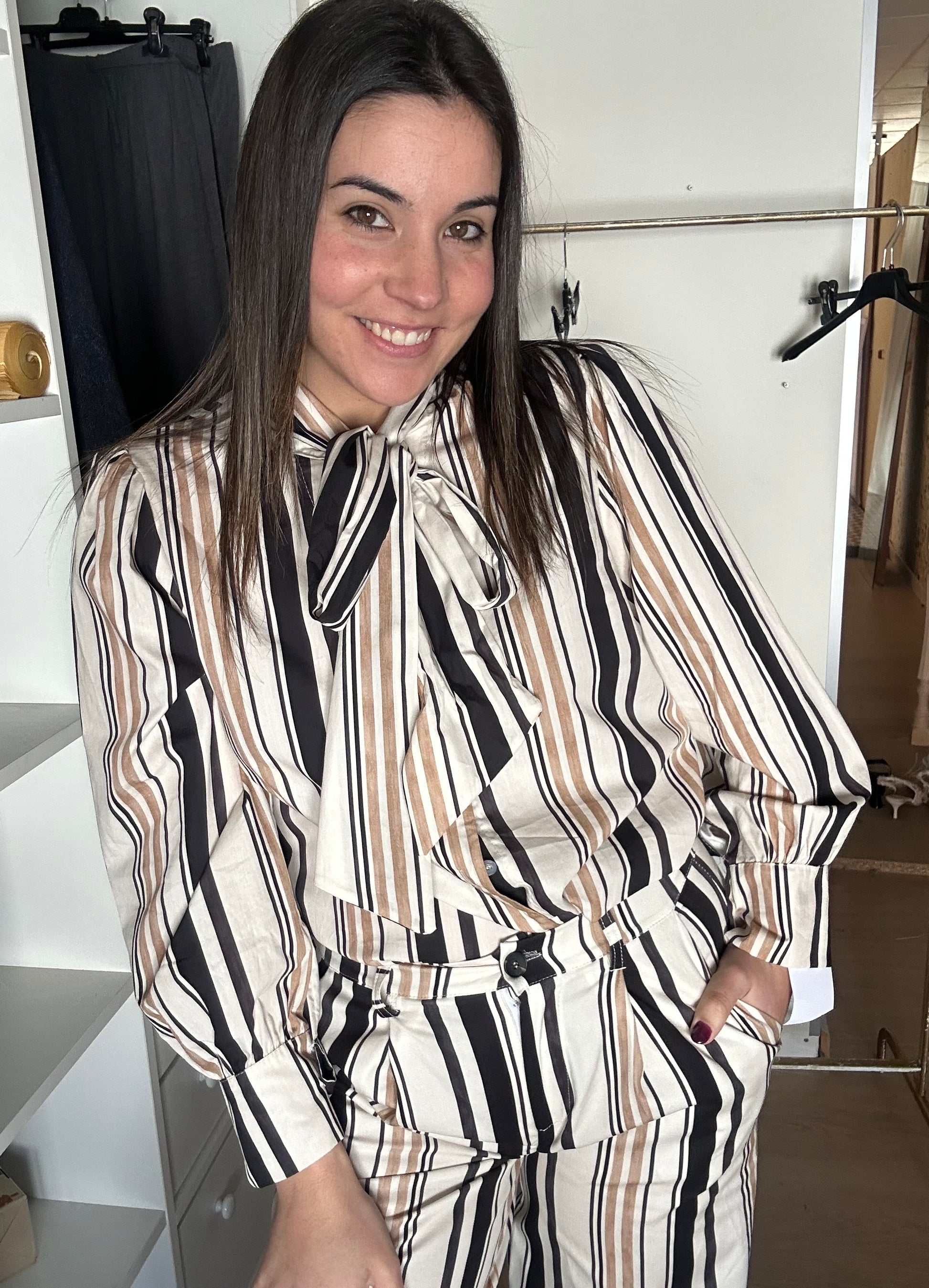 Conjunto dos piezas de pantalón de pinza con camisa lazada perfecto para evento. Talla S/M.