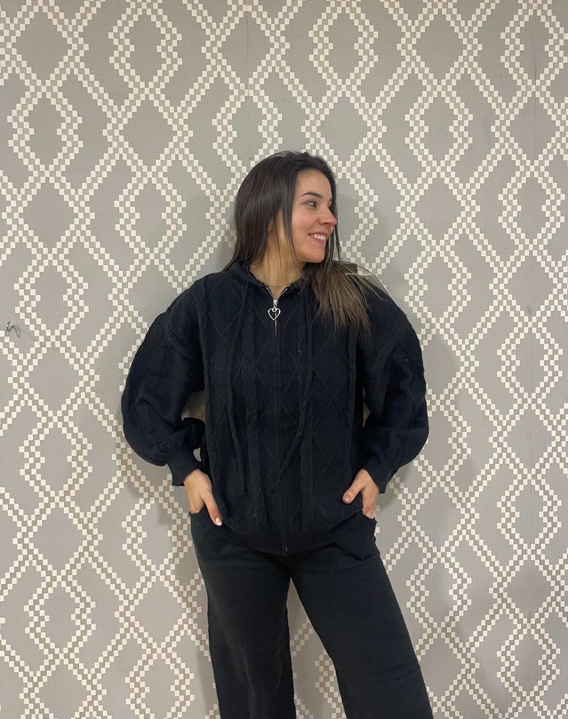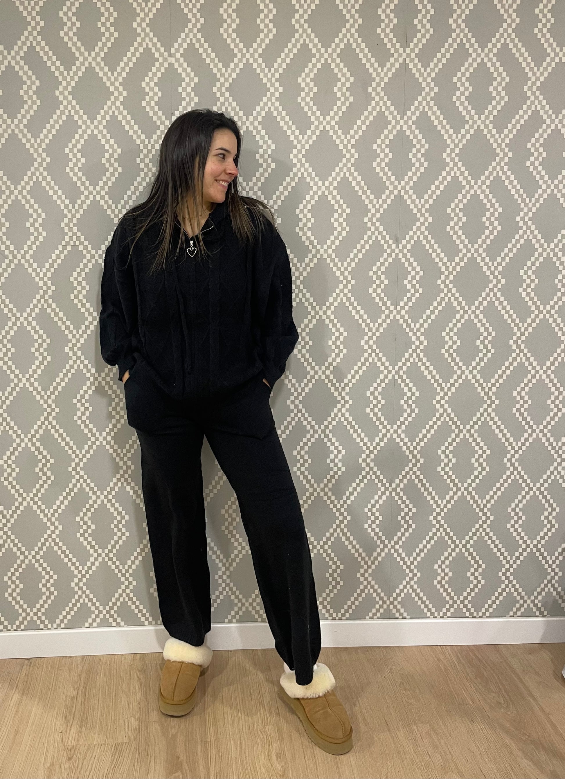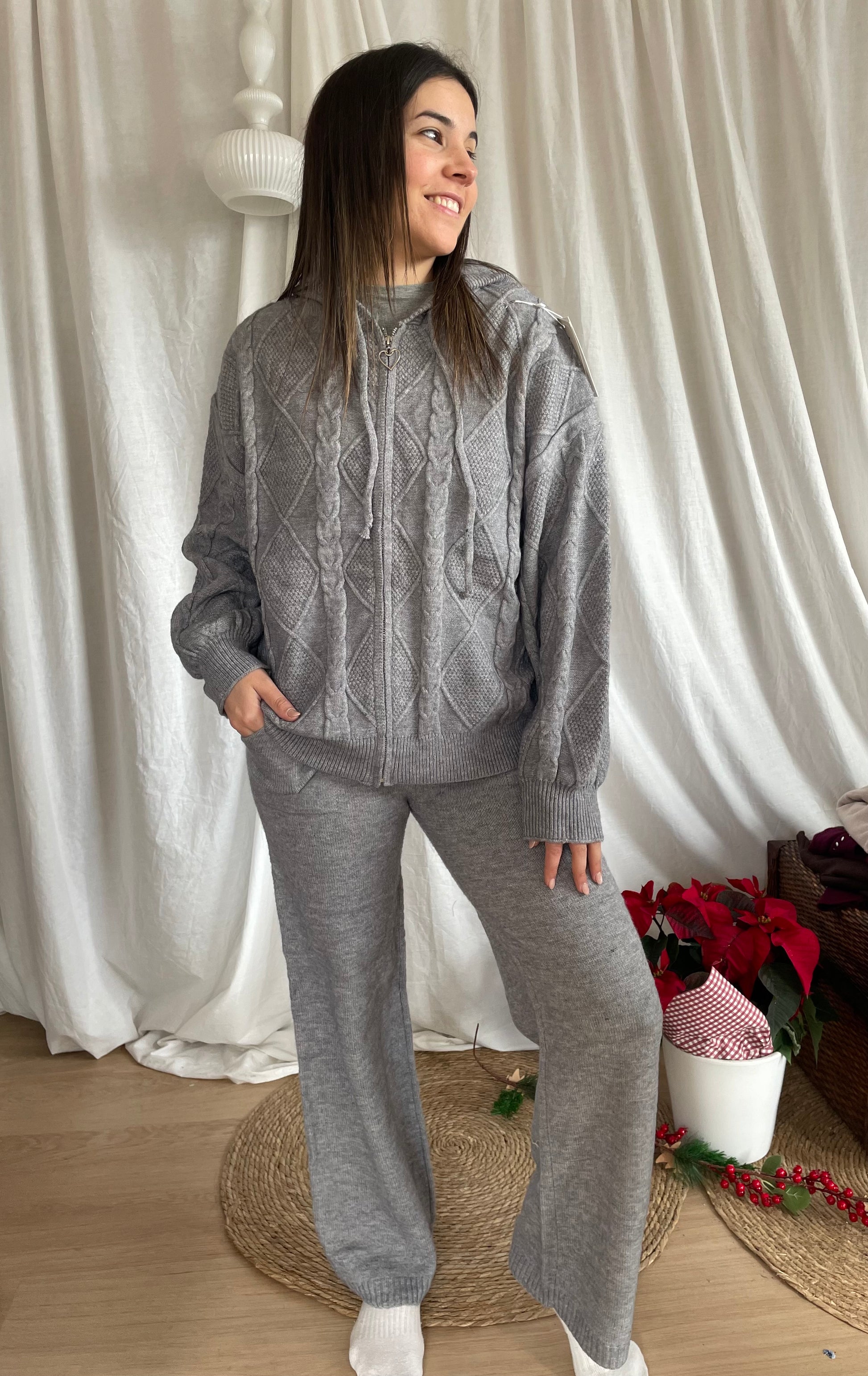Conjunto punto de dos piezas con pantalón ancho elástico y sudadera con cremallera y gorro. Talla única hasta 42.