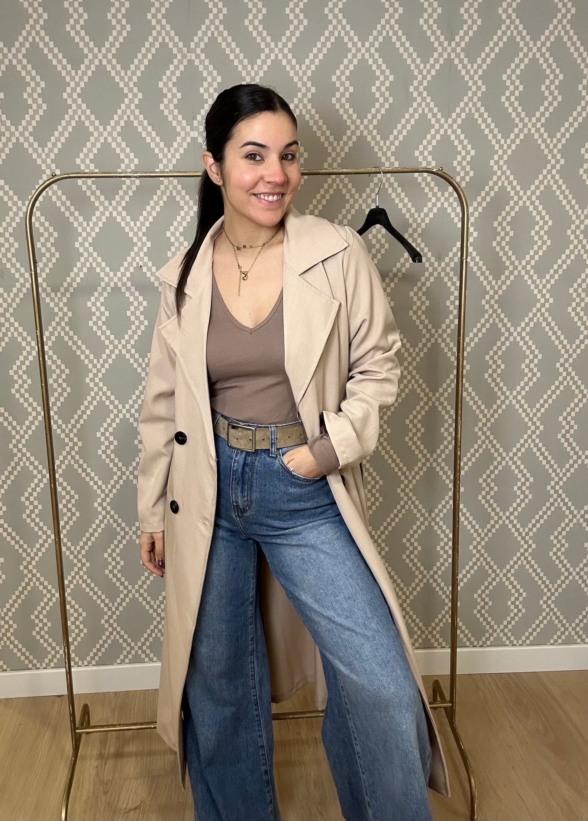 Gabardina fina entretiempo oversize con botones y cinturón. Talla única hasta 44.