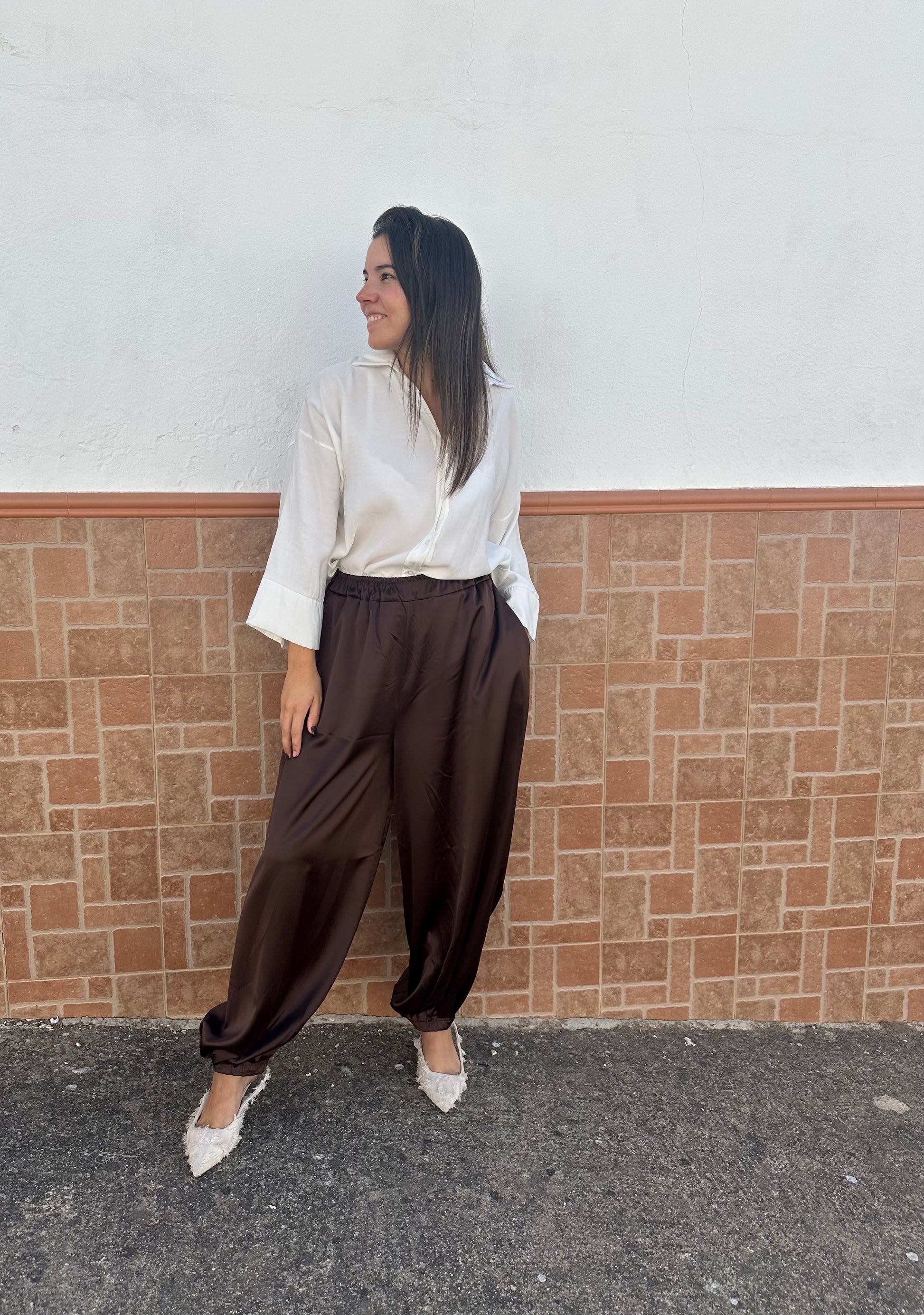 Pantalón satinado bombacho de tiro alto. Talla única hasta la 44-46.