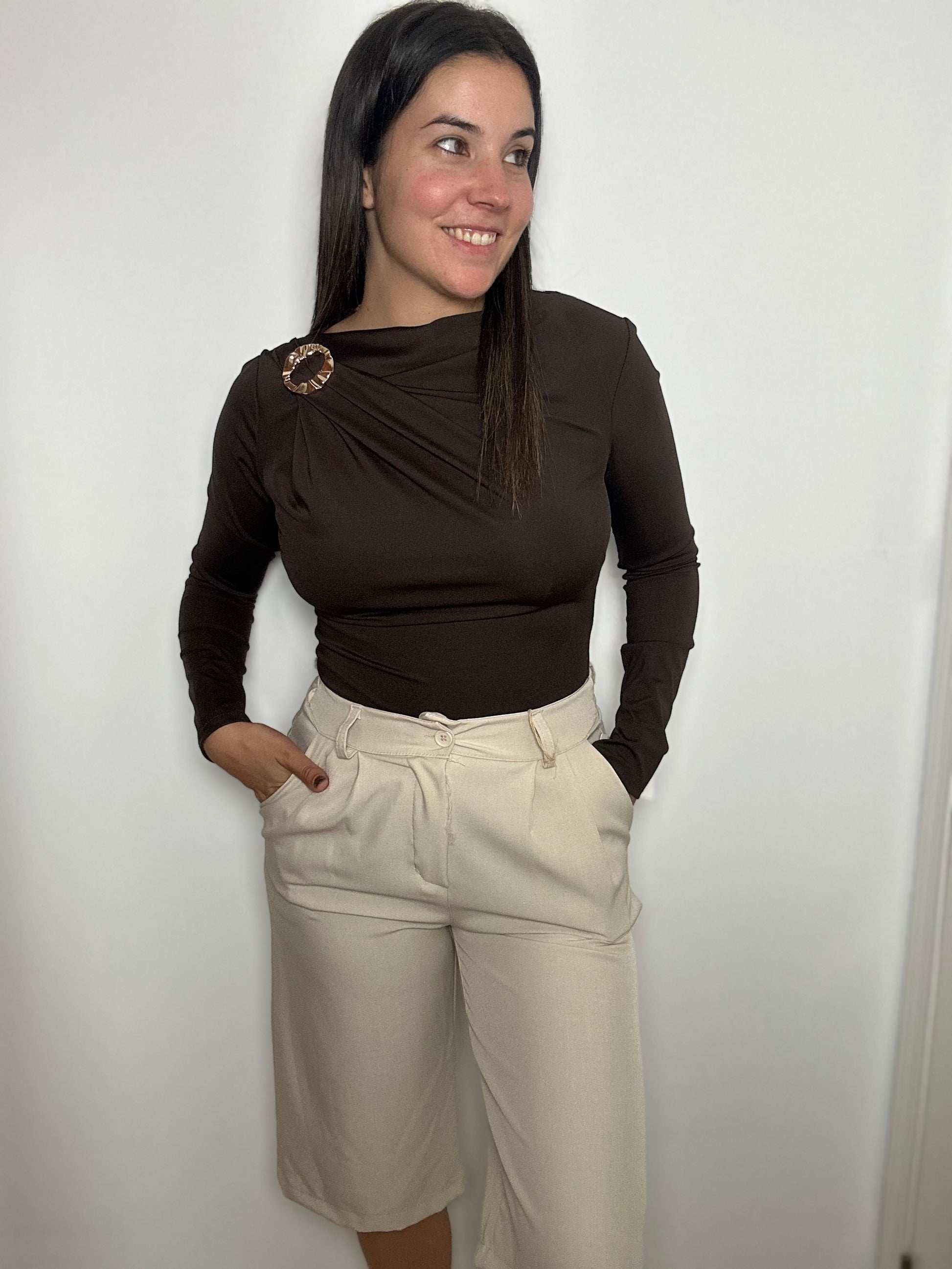 Top drapeado manga larga con detalle en el hombro de hebilla dorada. Talla única (hasta 38).