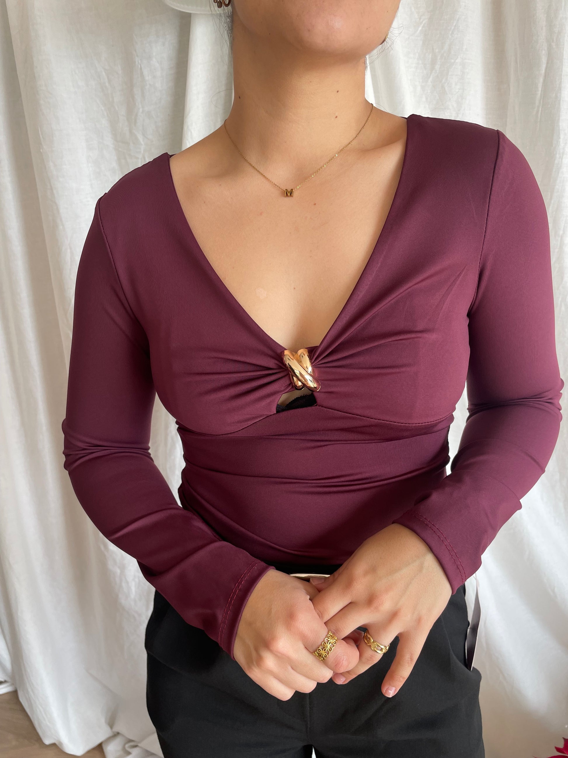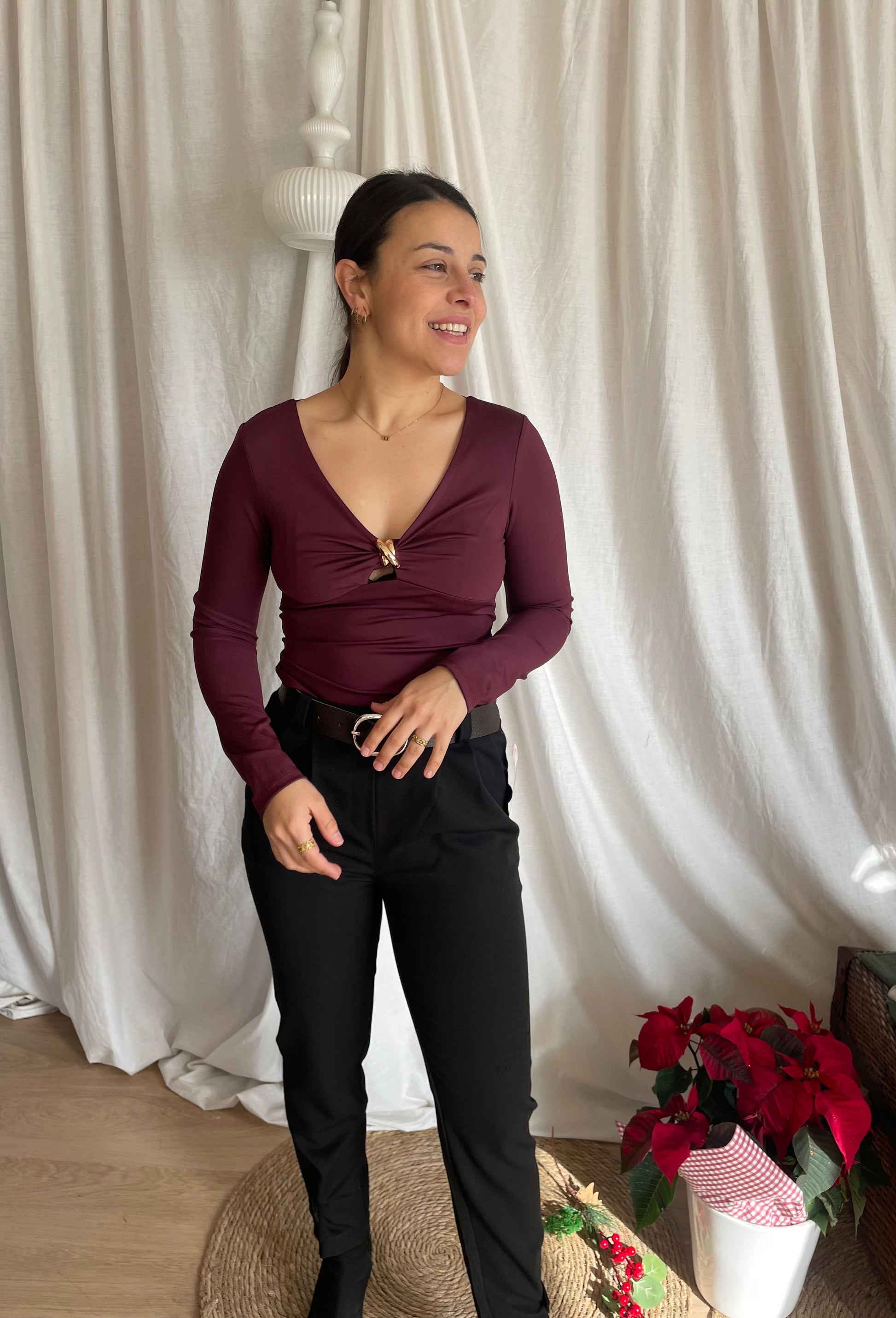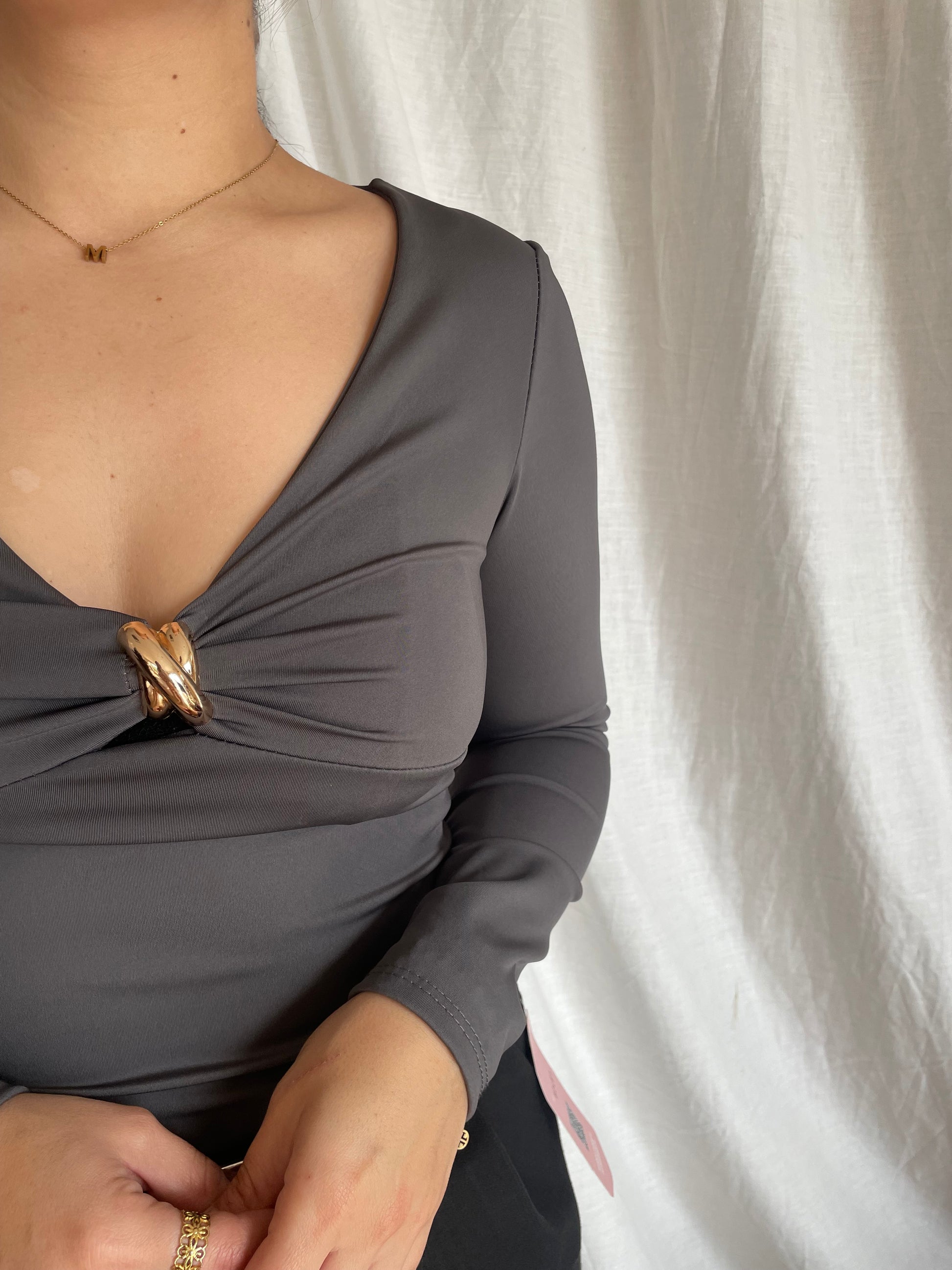 Top estilo crop con detalle de broche en el pecho. Licra fría. Talla única hasta la 40.