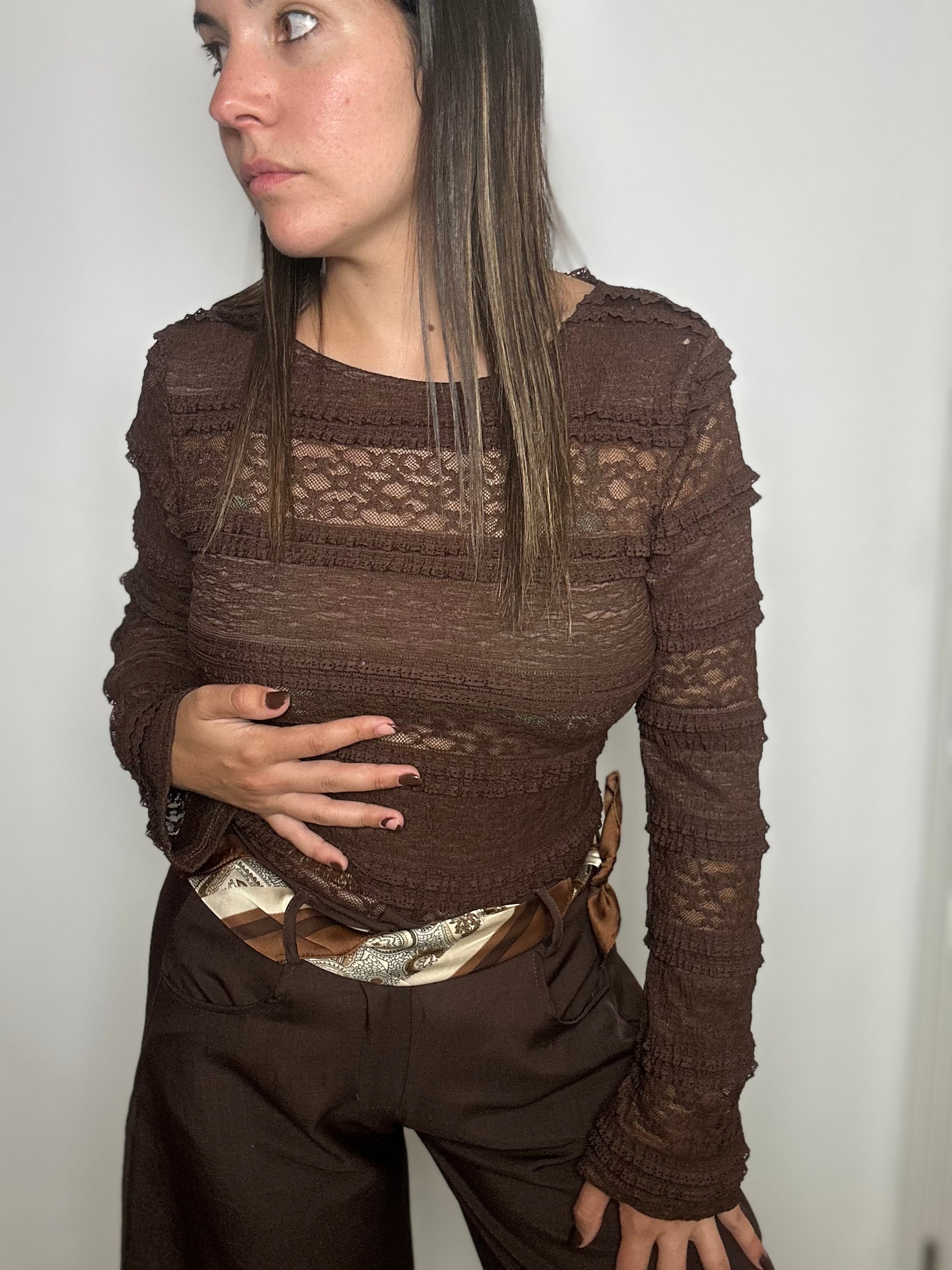 Top de manga larga con encaje y plumeti. Talla única hasta la 40.