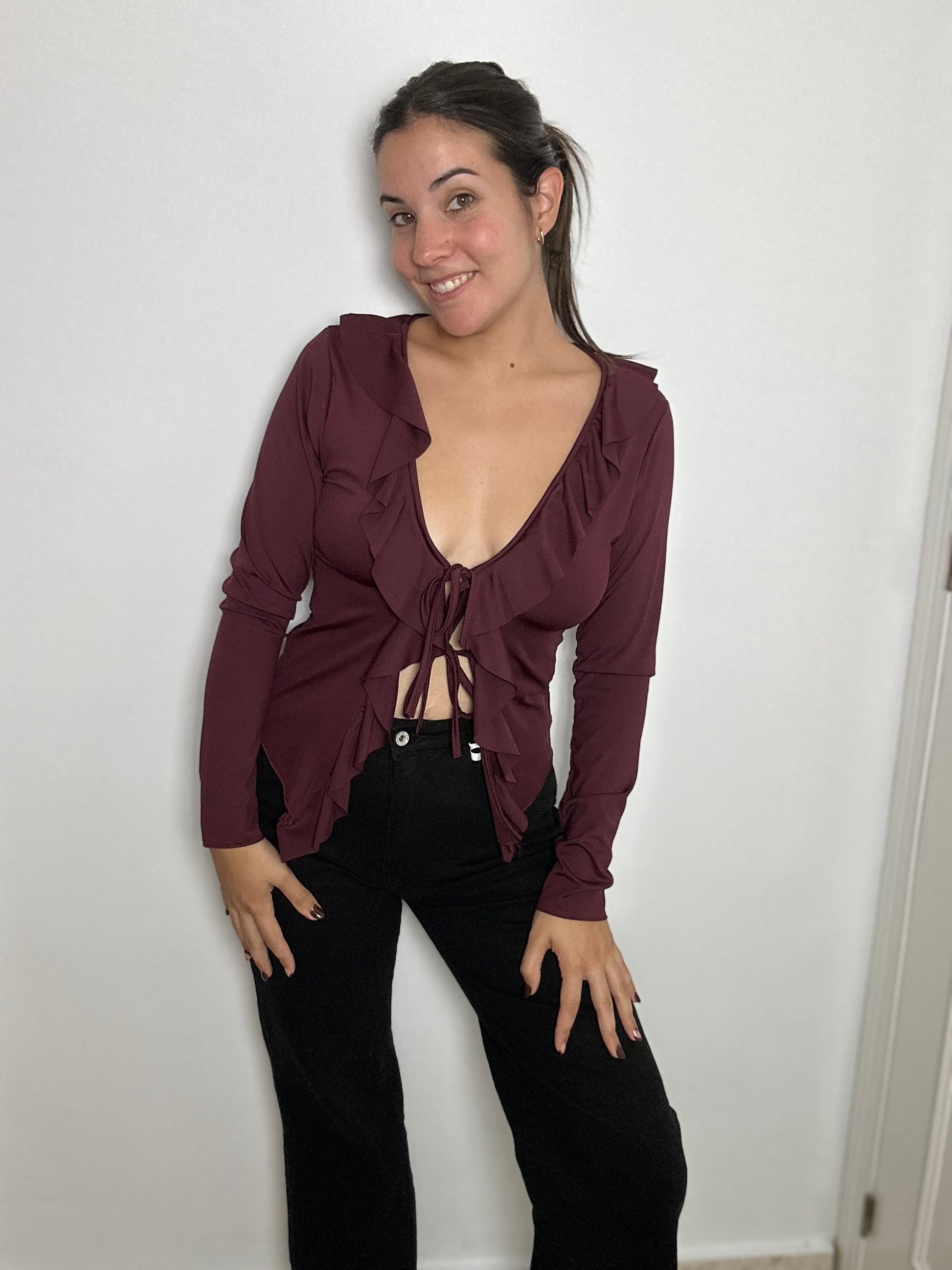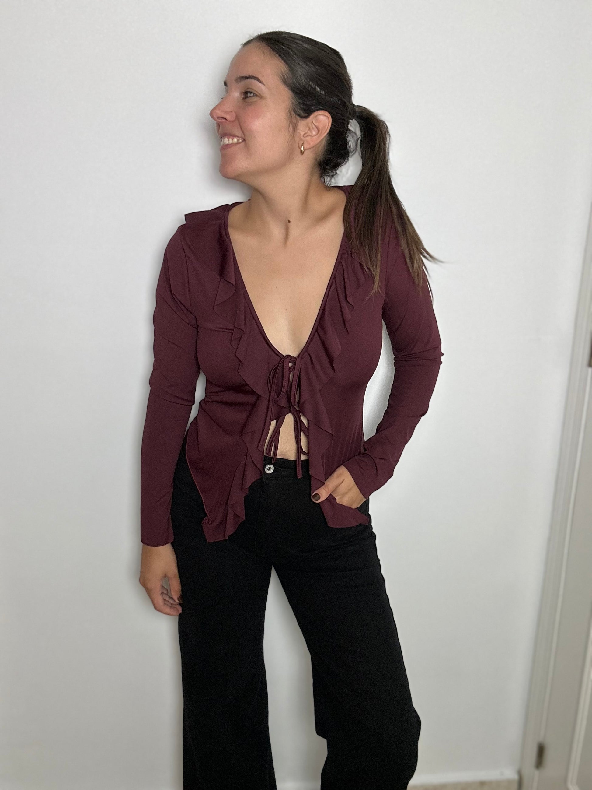 Top de licra con volante y detalle de abertura con lazada. Talla única hasta la 40.