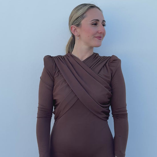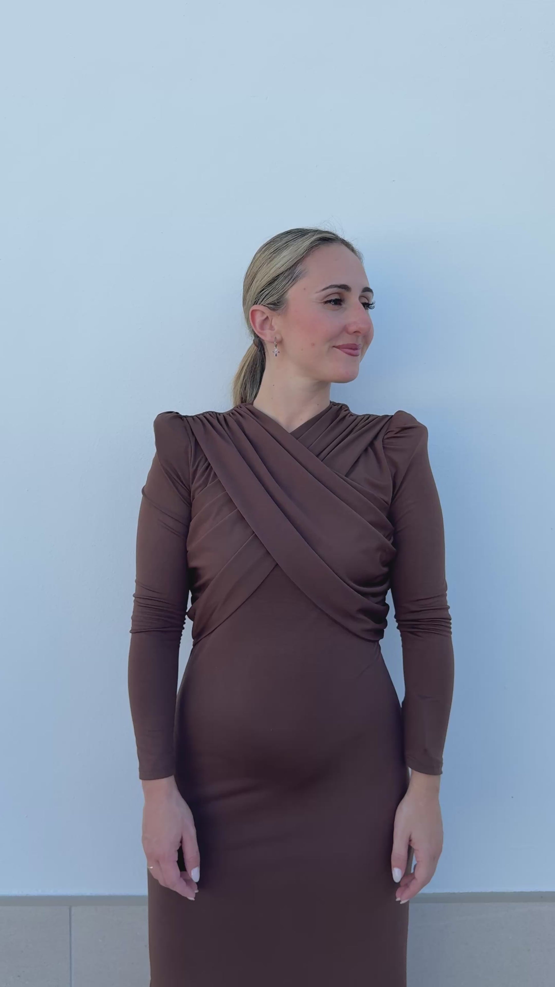 Vestido midi con escote drapeado, hombreras y raja trasera. Talla única.